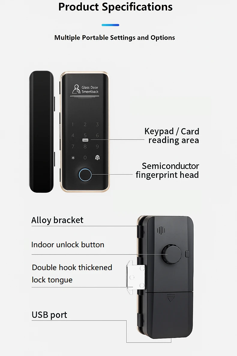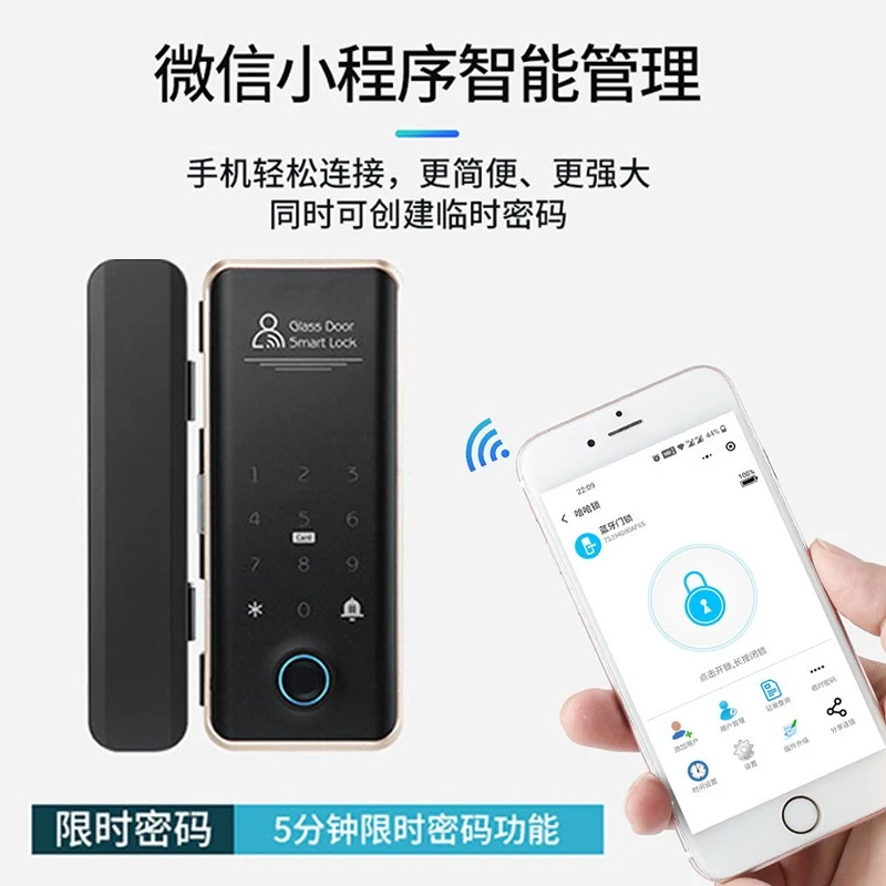 Produttore cinese di serrature per porte in vetro intelligenti - Progettata specificamente per porte in vetro commerciali, questa serratura intelligente Bluetooth presenta un'innovativa installazione a clip senza perforazione che richiede solo 5 minuti e non danneggia il vetro. Integra diversi metodi di sblocco, incluso il riconoscimento delle impronte digitali dei semiconduttori (veloce fino a 0,5 secondi), un mini-programma mobile, carte, telecomando e password temporanee, offrendo comodità e sicurezza senza pari. È un aggiornamento ideale per negozi, uffici, showroom e altri spazi.