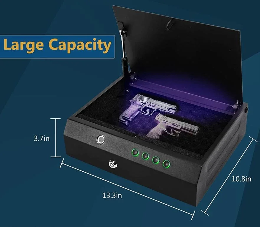 Fixed & Wall-Mounted Safes: Like our model with dimensions 94X338X275MM, made from powder-coated steel, using 4xAA batteries. It supports fingerprint/password/key access, features a low-battery indicator, and is designed to securely hold 2-3 handguns for home, office, or commercial use.