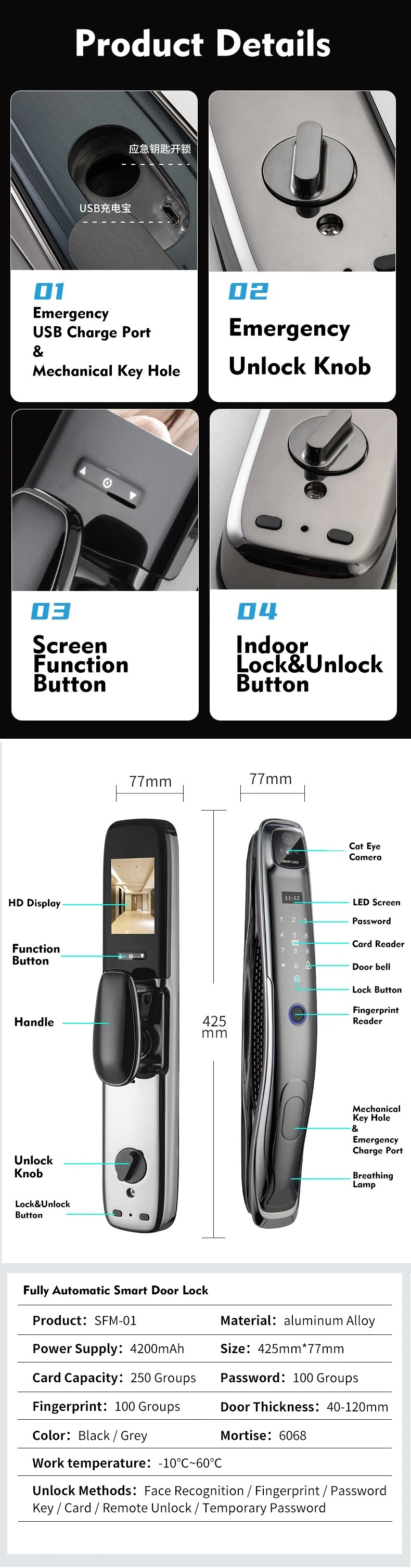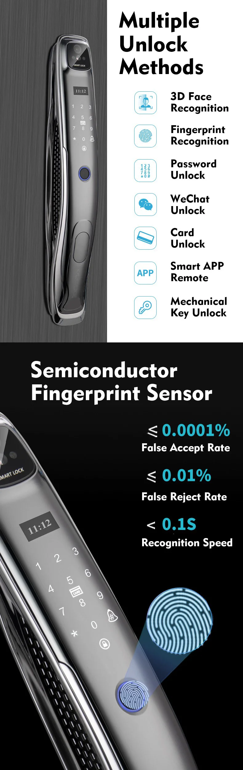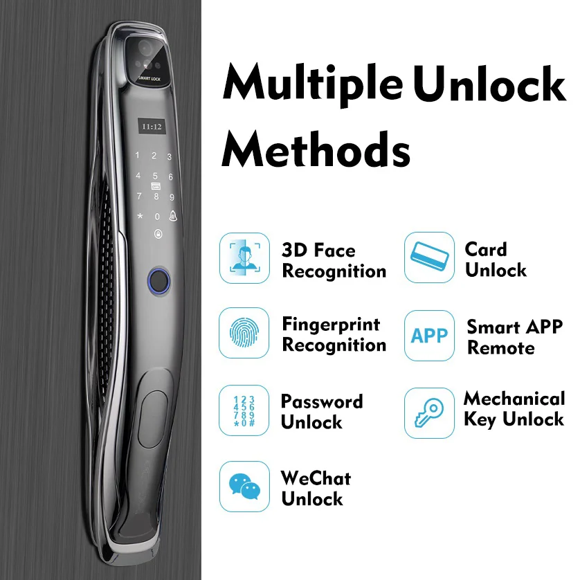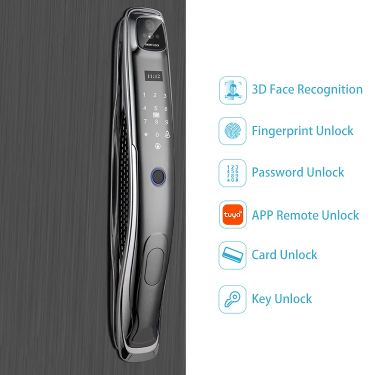 China Password Fingerprint Lock Supplier | This 3D Face Recognition Smart Door Lock, a fully automatic smart lock designed to redefine home security and convenience. Featuring advanced 3D facial recognition technology, this sleek aluminum alloy door lock enables hands-free access with just a glance—perfect for busy lifestyles. Whether you're returning home with groceries or entering in the dark, the built-in infrared sensor ensures accurate identification even in low-light conditions. With multiple unlocking methods including fingerprint, password, card, WeChat, app control, and mechanical key, it offers unparalleled flexibility.