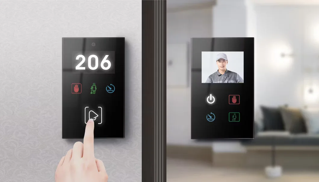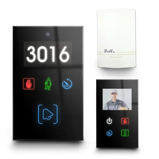 Doorbell and Electronic Doorplate Manufacturer China | The innovative touchscreen doorbell systems for hotels can be designed and produced in a customer-specific way. In addition to a doorbell system, it also replaces the cardboard DND hangers. Guests can indicate via an indoor panel if they do not want to be disturbed or that the room can be cleaned. Different models are available, with or without room number. Equipped with high-quality touchscreen system with LED background lighting. Staff immediately sees if the guest does not want to be disturbed or that the room can be cleaned.