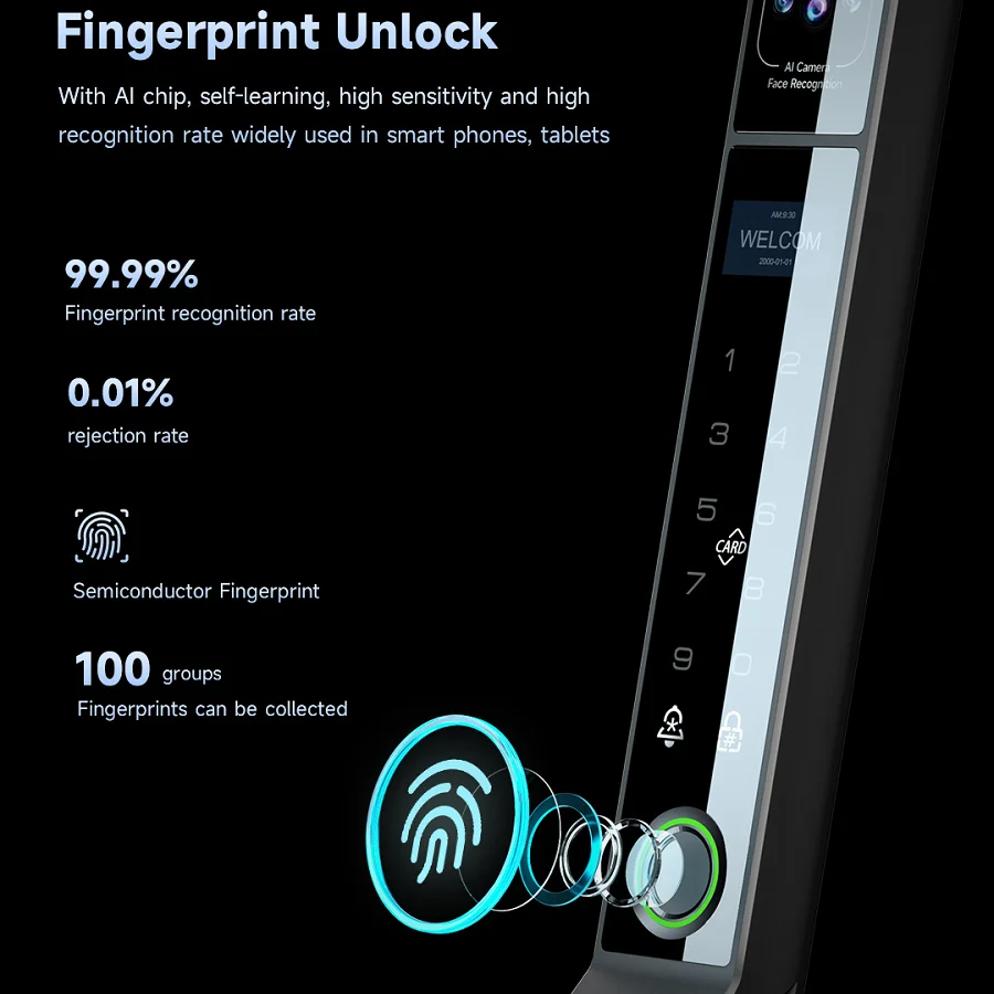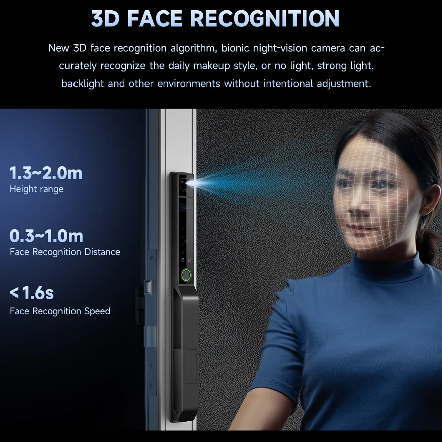 China Smart Glass Door Lock Manufacturer | New 3D face recognition algorithm, bionic night-vision camera can ac-curately recognize the daily makeup style, or no light, strong light, backlight and other environments without intentional adjustment.