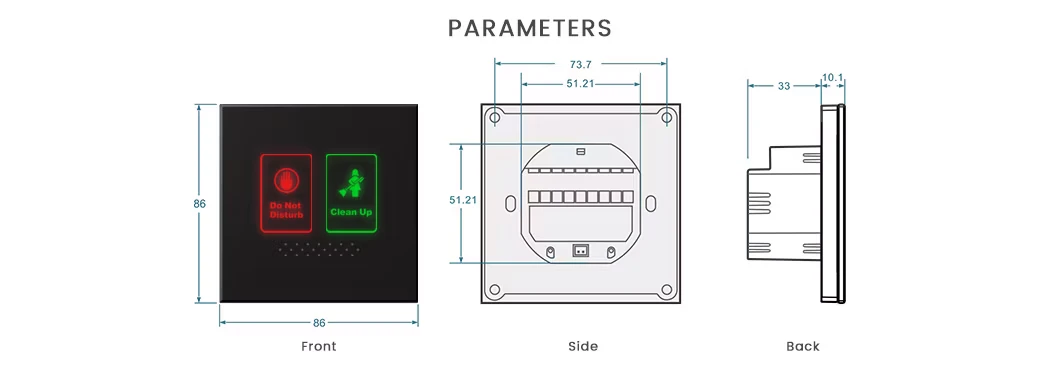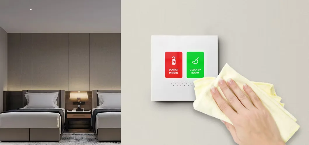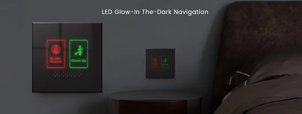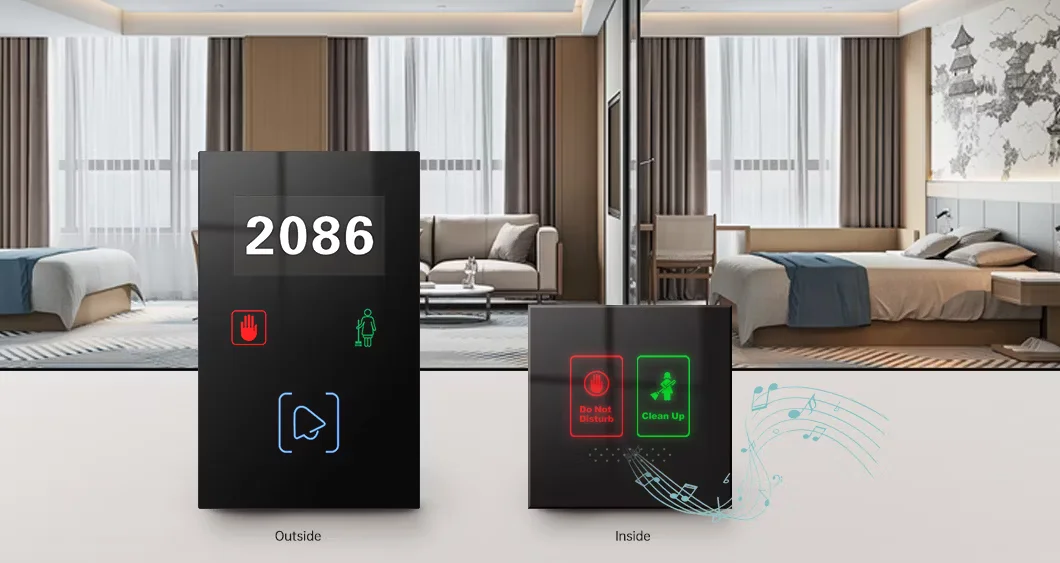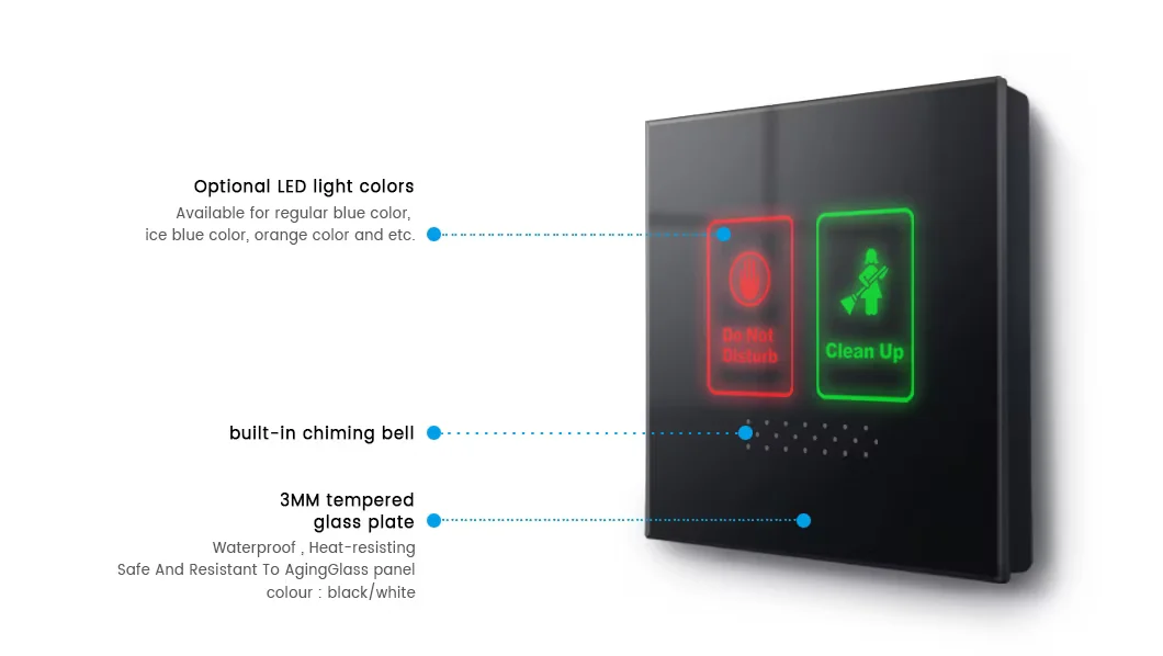 3. One-stop procurement: We also provide accessories for room number plates, such as indoor door control panel, doorbell and other products required by smart hotel, such as the same appearance series of touch switches for light control/ temperature control/curtain control, power take-off switches, sockets and so on.