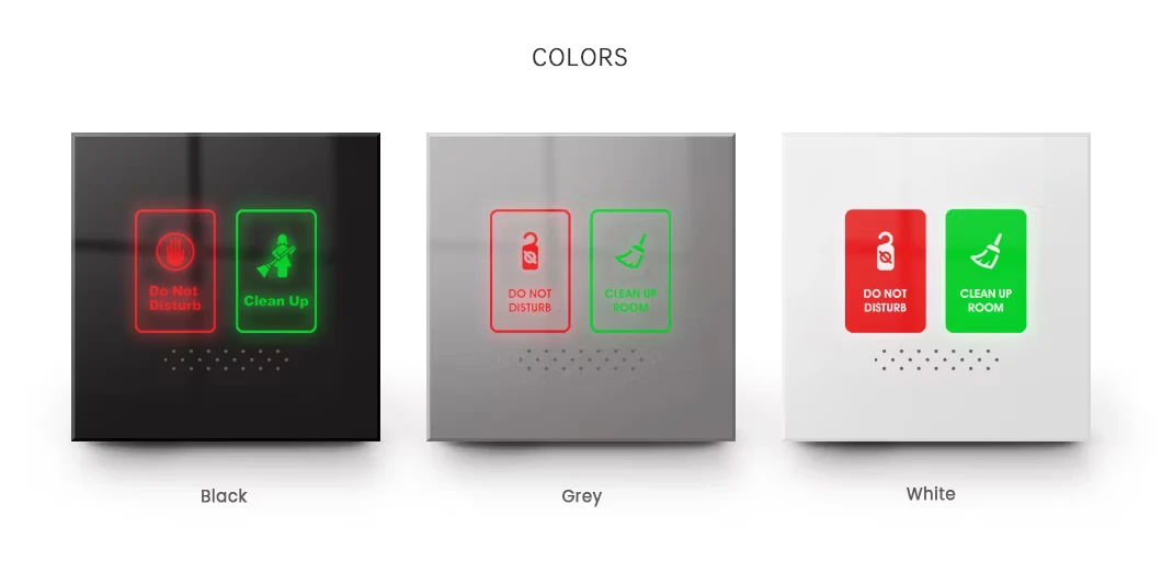 2. Doorplate functional content customization: Functional button content: do not disturb/ clean/ laundry/ wait/ check-in/ring(optional). And the font, language, icon content and LED light color of the button content can be customized.